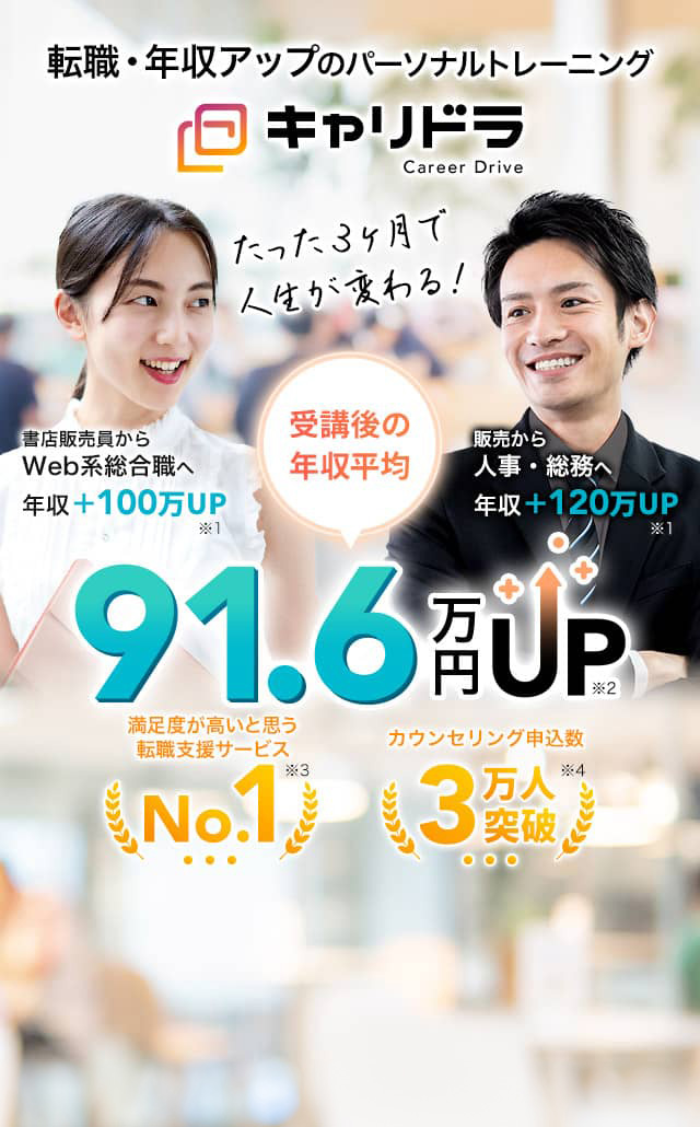 ※1:2021年7月~2022月4月のキャリドラ受講者の転職実績より ※2:キャリドラ受講開始後に転職先が確定した直近30人の平均年収アップ金額 (2022年2月1日時点) ※3:回答者数:1,200名/実施対象:全国の男女/調査方法:インターネット調査/調査概要:2021年9月 サイトのイメージ調査/調査提供:日本トレンドリサーチ/本調査はサイトのイメージをもとにアンケートを実施し集計しております。/サービス(商品)の利用の有無は聴取しておりません。 ※4:2022年6月10日時点